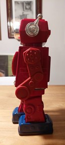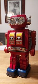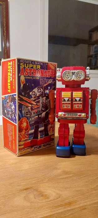 Super Astronaut-robot gemaakt in Taiwan door het bedrijf SJM eind jaren 70. Het is een op batterijen werkende robot, gemaakt van blik en blik, met draaiende actie, openslaande deuren en schietende geweren. Het presenteert een chromen frontplaat met felle kleuren. Deze robot is in uitstekende cosmetische en werkende staat (hoewel hij erg luidruchtig is en langzaam loopt). Originele doos wordt meegeleverd in bijna perfecte staat, geïllustreerd met prachtige kleuren.