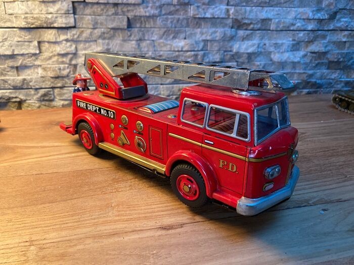 - de in Japan gemaakte metalen vrachtwagen, TN Nomura in volledig werkende staat, de lamp brandt en hij rijdt zeer goed, de ladder draait vanzelf. Meet 26 cm lang en 8,5 cm breed.