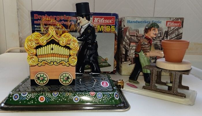 Verzameling van (2) willesco items, nostalgische ton, orgeldraaier met melodie, en harde werker Serie, in uitstekende staat, en met originele dozen.