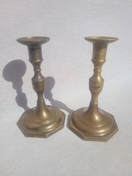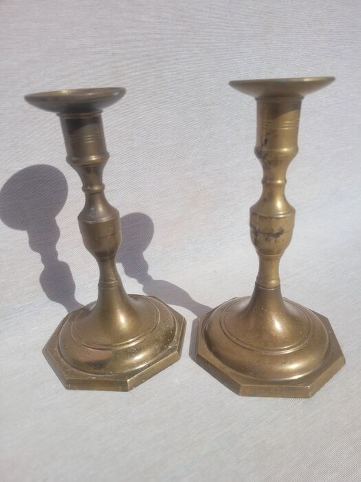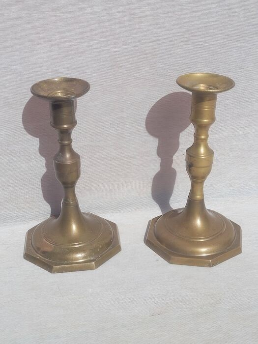 Een goed paar kandelaars uit de 18e/19e eeuw, messing achthoekige voetkandelaars met gedraaide bolvormige kolommen aan de houders. Gemaakt in Engeland.