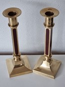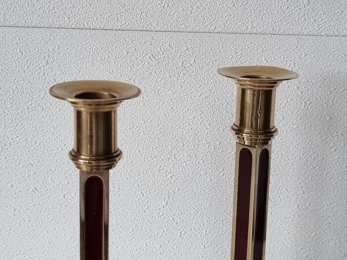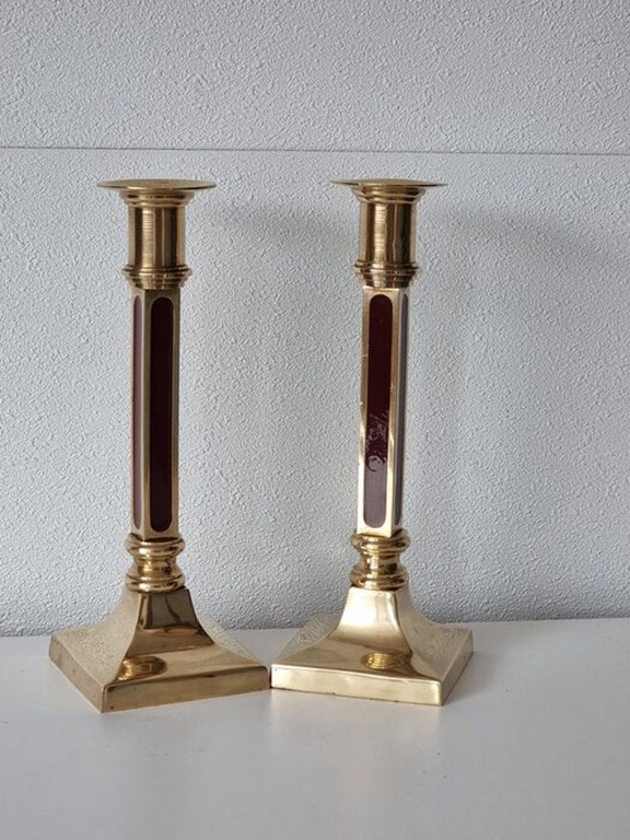 Stijlvolle elegante kolomvormige kandelaars van brons met rood emaille in de kolom verwerkt.