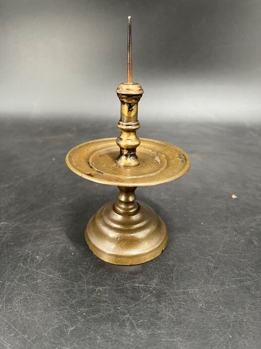Schitterend uniekeHollandse messing kraagkandelaar met balustervormige stam en ronde voet.