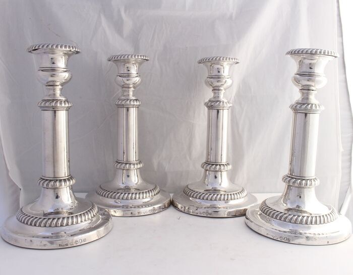 Aantrekkelijke, Georgische, antieke sterling zilveren zilveren set van vier kandelaars in Regency-stijl, met ronde balusterlichamen, met verwijderbare mondstukken en zittend op ronde voetstukken, allemaal met met de hand gegroefde meloengecanneleerde decoratie, aangebrachte gadroon-randen en originele houten voetstukken.