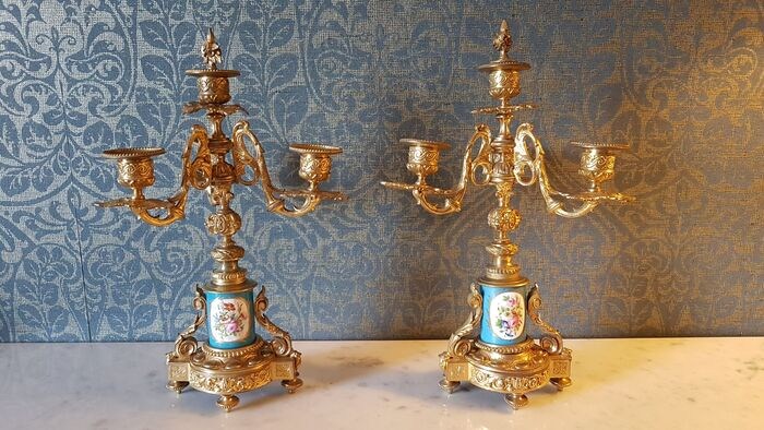 Twee fraaie bronzen kandelaren metporselein.Verguld brons en puntgaaf porselein en stammen. Napoleon lll.In goede staat met sporen van gebruik.Niet gerestaureerd.