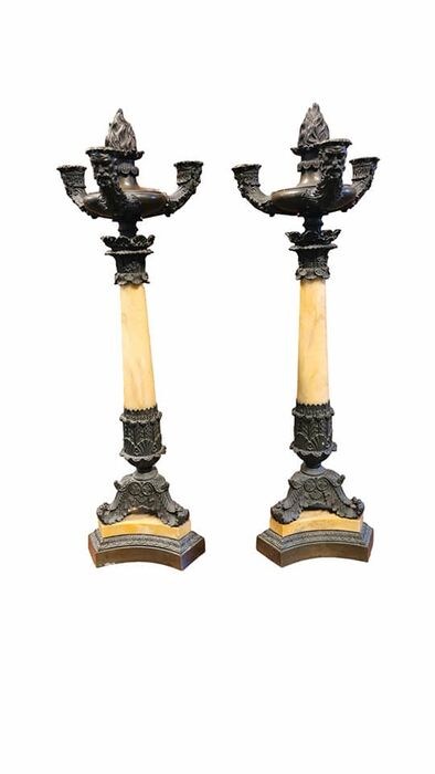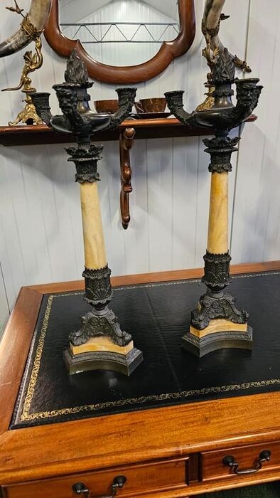 Twee zeer grote vroeg antieke Louis Philippe bronzen kandelaren met marmeren tussenstuk.