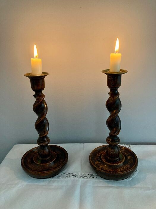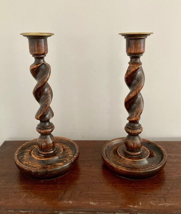 Erg mooie eikenhouten kandelaars uit Engeland. De zo genoemde ‘Barley Twist’ kandelaars.