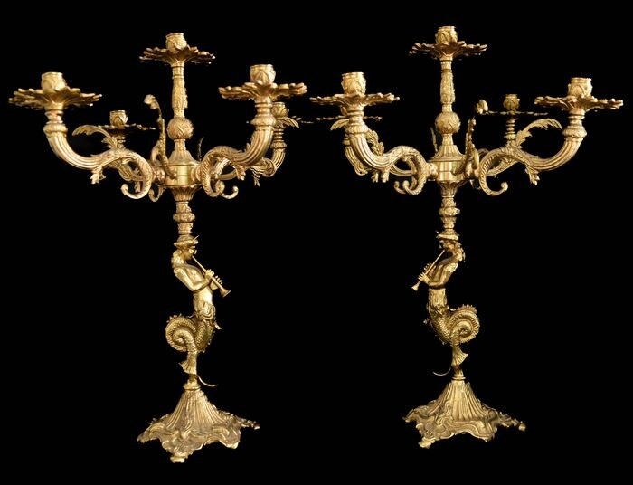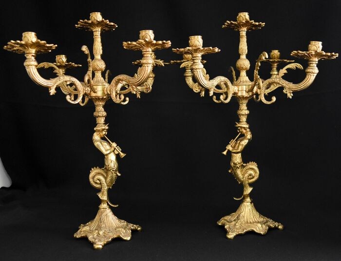 Oude kroonluchters van brons met de afbeelding van prachtige zeemeerminnen die een zeehoorn bespelen.