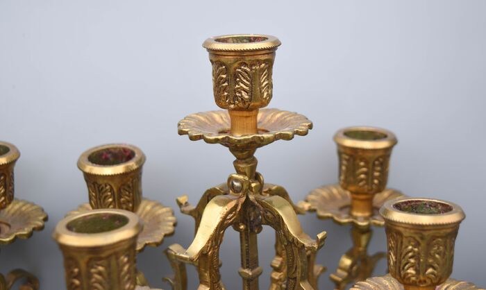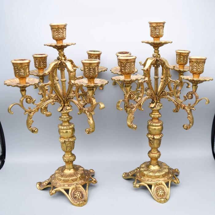 Antieke bronzen kandelaars rijkelijk gedecoreerd - Voor 5 kaarsen.