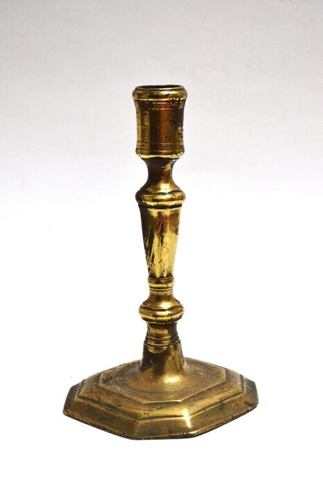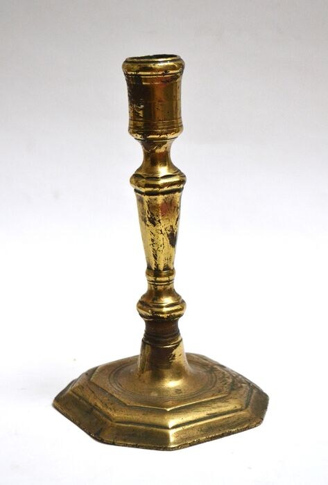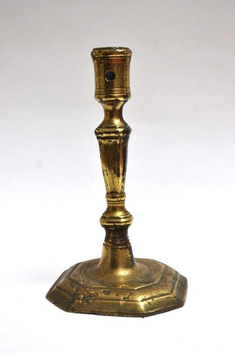 Antieke koperen kandelaar. Frankrijk, begin 18e eeuw. 17,9 cm hoog.