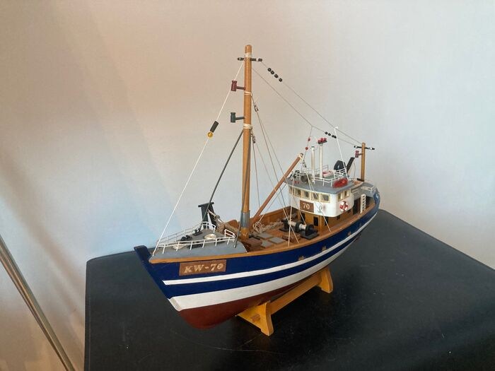 Deze bijzonder fraaie kotter , trawler , ziet er perfect uit en is zeer gedetailleerd. Het is een schaalmodel helemaal van hout gemaakt. De kleurstelling is mooi het is de KW-70 uit Katwijk.