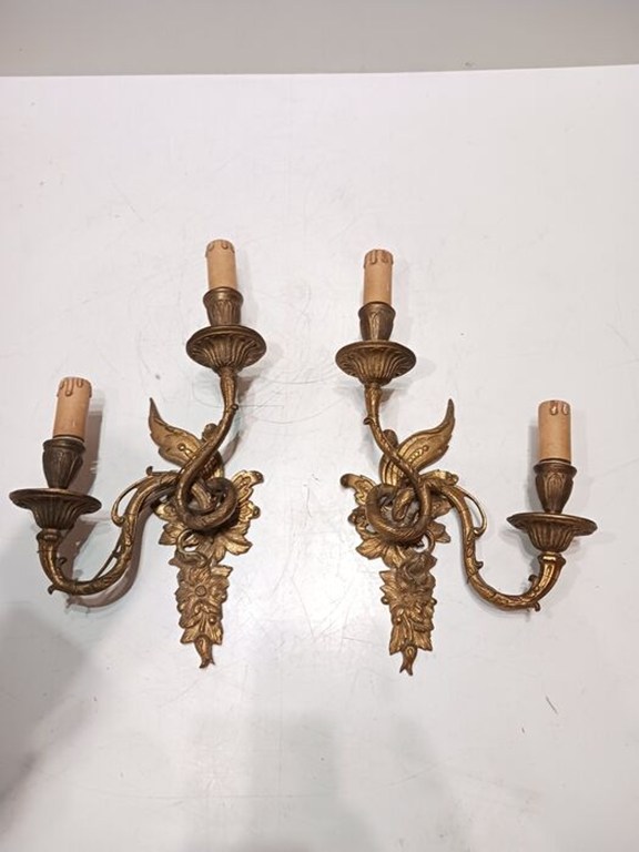 Prachtig paar bronzen wandkandelaars, gemaakt in Italiƫ in het begin van de 20e eeuw, aanvankelijk als kandelaars en vervolgens geƫlektrificeerd in het midden van de 20e eeuw, het externe systeem. Elke applique heeft 2 lamphouders op verschillende hoogtes. In goede staat, merk op dat ze aanvankelijk verguld waren, de patina is in de loop van de tijd donkerder geworden, minimale gebruikssporen. Het totale gewicht is 2,5 kg. De hoogte is ongeveer 34 cm.